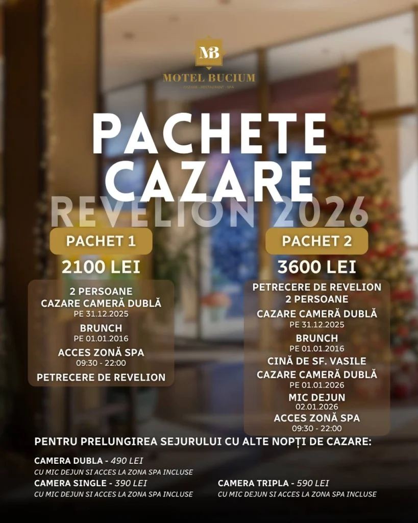 Motel Bucium a pregătit două variante de pachete pentru Revelion 2026, potrivite atât pentru cupluri, cât și pentru familii:
