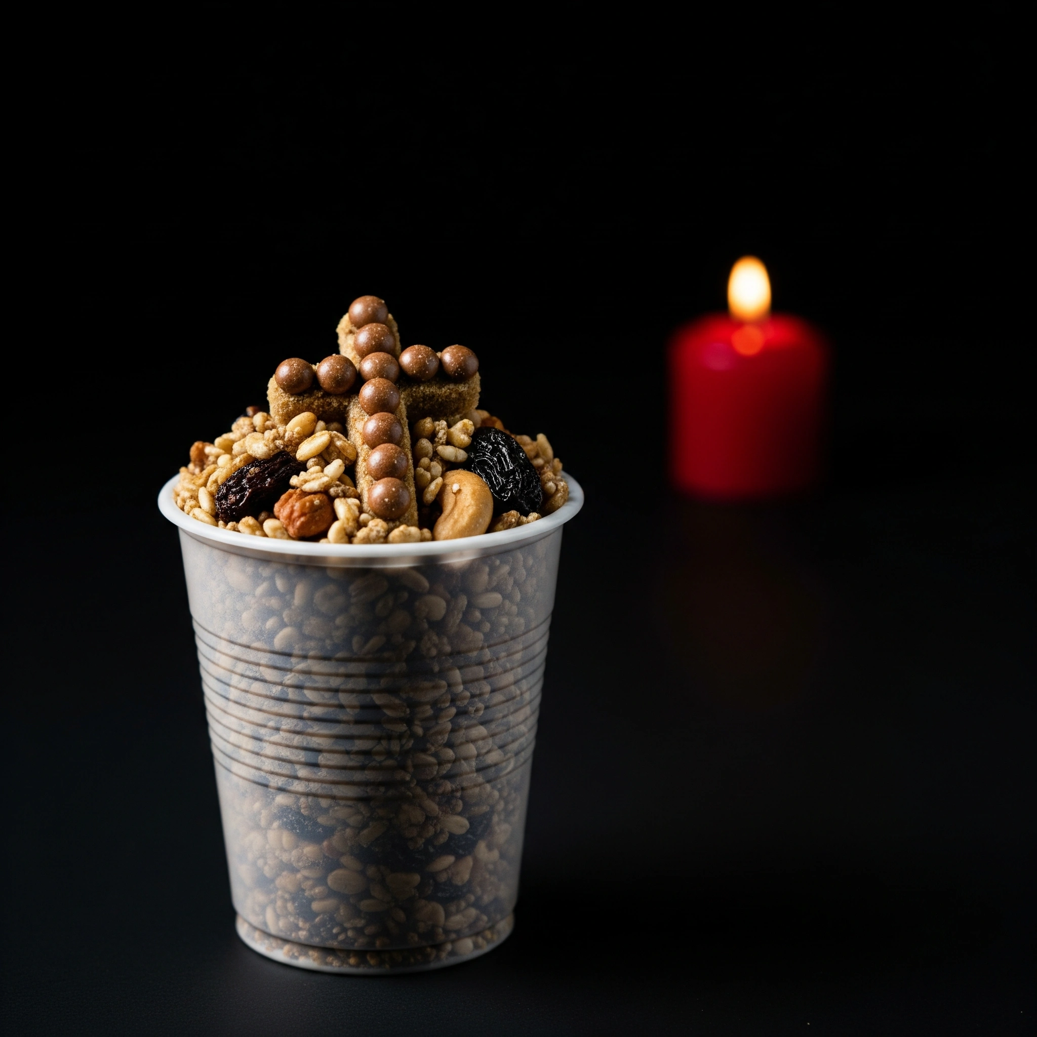 Colivă tradițională, preparată din grâu fiert, îndulcită cu zahăr și aromată cu esență de rom sau vanilie, porționată igienic în păhărele individuale. Presărată cu nucă măcinată și decor tradițional, este o soluție practică și elegantă pentru parastase, pomeni sau alte momente de reculegere. Simbol al credinței și al pomenirii celor dragi.