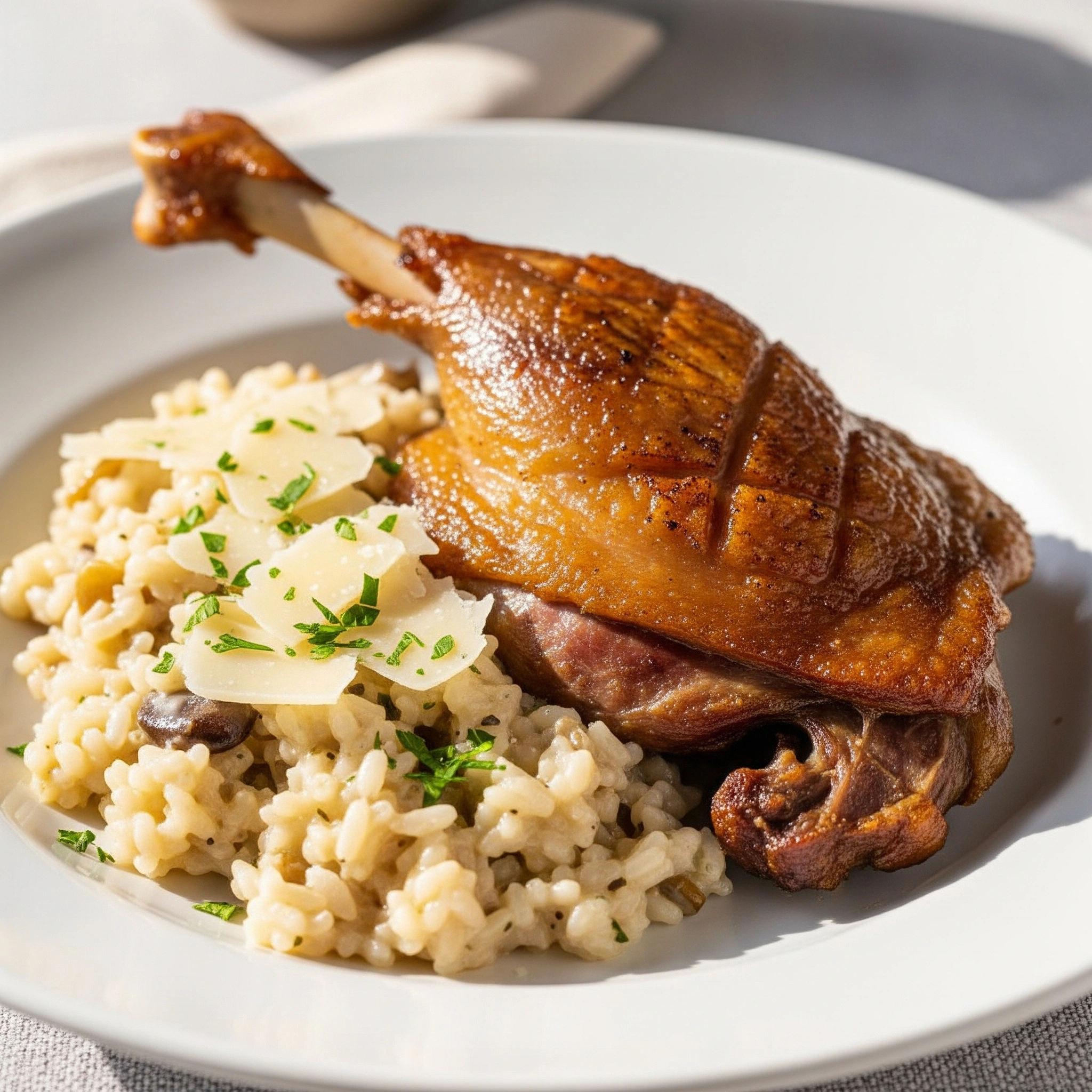 Pulpă de rață fragedă, rumenită lent până capătă o crustă crocantă și o carne suculentă, servită alături de un risotto cremos, îmbogățit cu parmesan ras fin. Combinația perfectă între textura intensă a cărnii și delicatețea orezului cremos, acompaniată de arome rafinate, transformă acest fel într-un adevărat festin pentru simțuri.